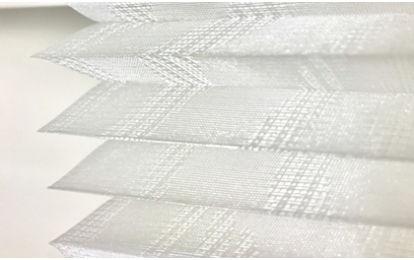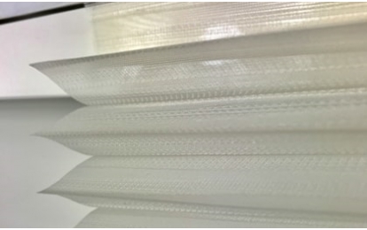 Cortina plisada en tejido de transparencia alta, con un efecto de rayas ondulantes verticales.